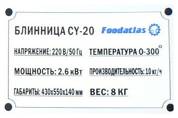 Блинница Foodatlas CY-20 используется на предприятиях общественного питания и торговли. Модель оснащена терморегулятором. Корпус выполнен из нержавеющей стали 430, конфорка - из алюминия. Дополнительные характеристики: